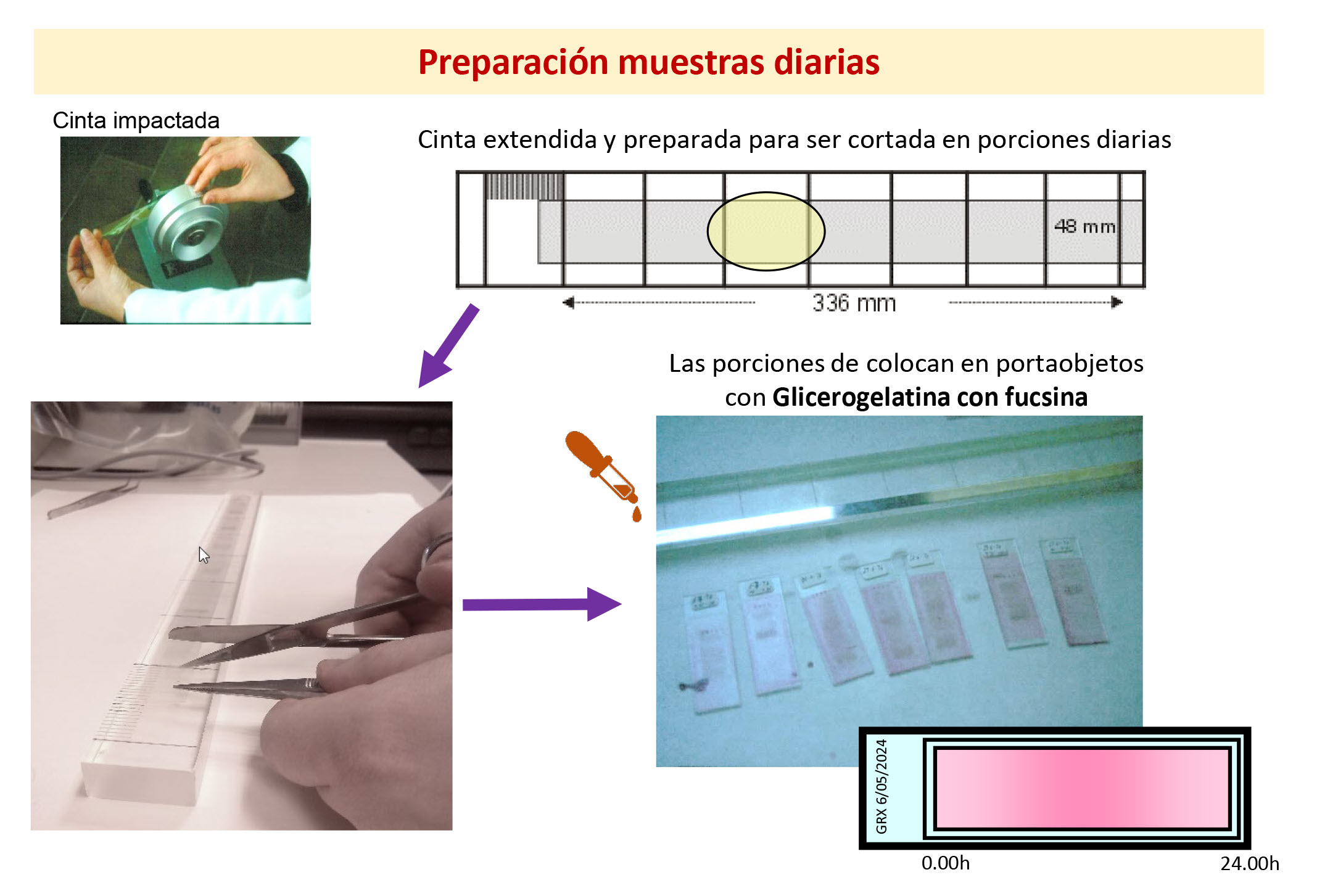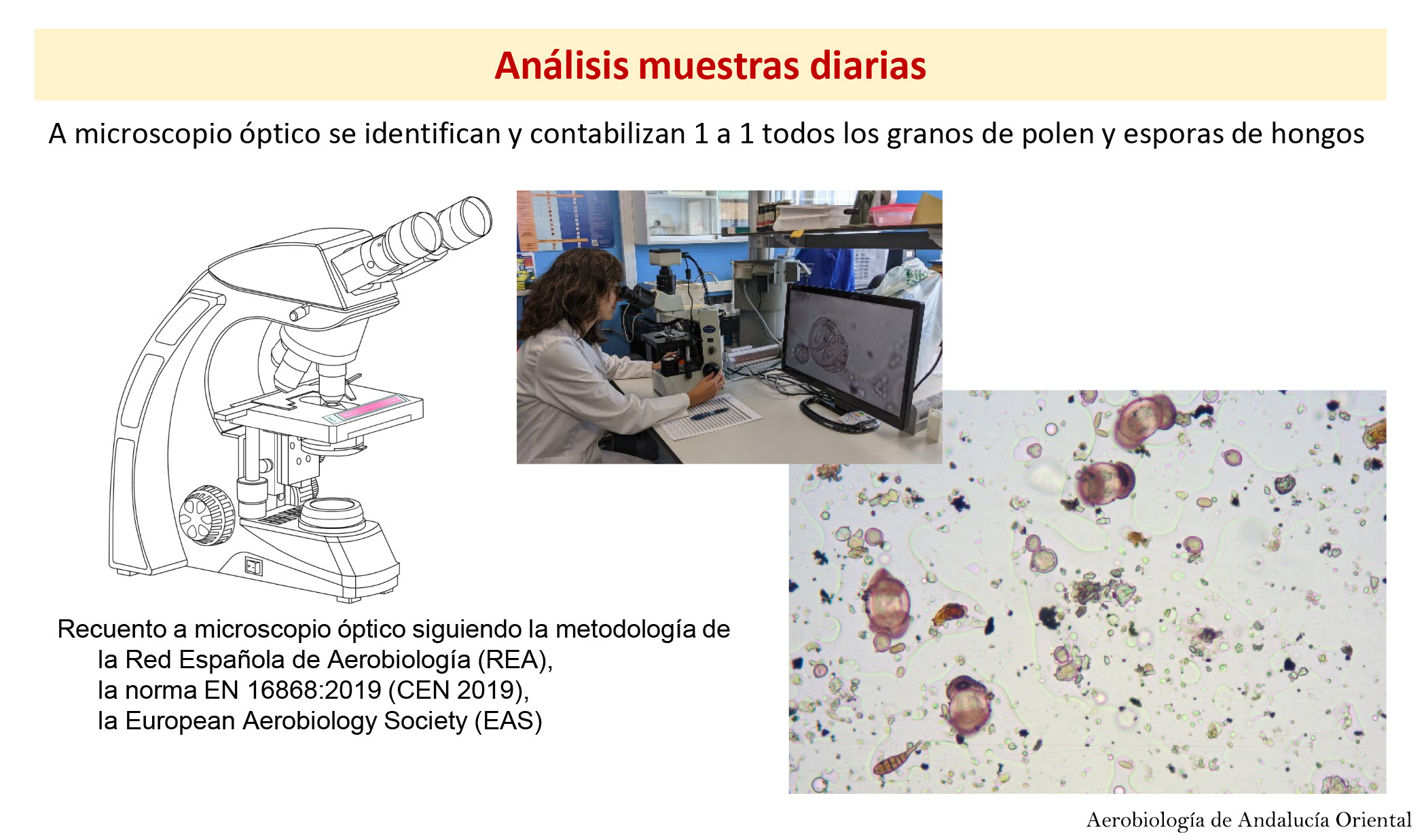 La superficie impactada se corta en fragmentos correspondientes a los días de la semana y cada uno de ellos es montado en una preparación de microscopía óptica, teñido y fijado. Se llevan al microscopio óptico donde son analizados mediante la identificación y conteo de todas las partículas biológicas presentes en la preparación. Los resultados se expresan en granos de polen o número de esporas por metro cúbico de aire (granos/m3; esporas/m3). Los captadores utilizados han sido el modelo Burkard Ltd. y Lanzoni s.r.l.