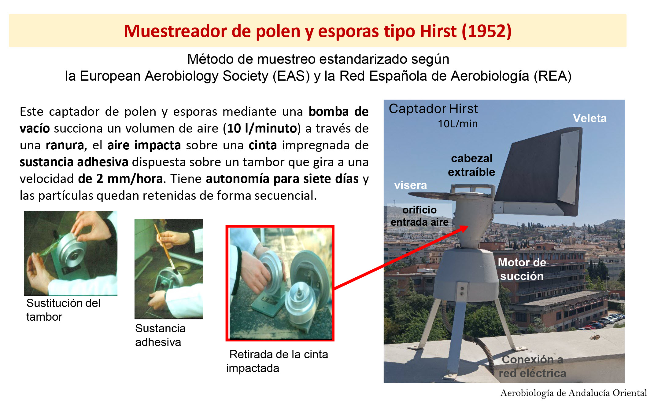 El estudio de las partículas biológicas aerovagantes se realiza utilizando un captador tipo Hirst siguiendo los estándares establecidos por la Red Española de Aerobiología en su Manual de Calidad y Gestión, y la norma EN 16868:2019 (CEN 2019).